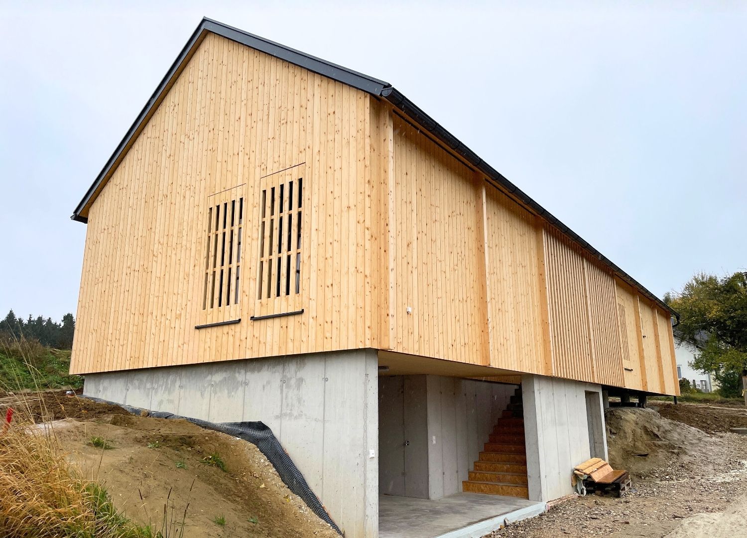 Das Untergeschoss des Einfamilienhauses in Beton, darüber ein Holzbau mit auskragender Konstruktion – beides ausgeführt aus einer Hand von Stern & Hafferl Bau.