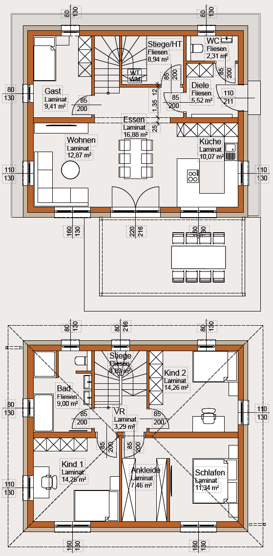 *130,43 m² Nettogrundrissfläche – 7,62 m² Stiege (EG, OG)